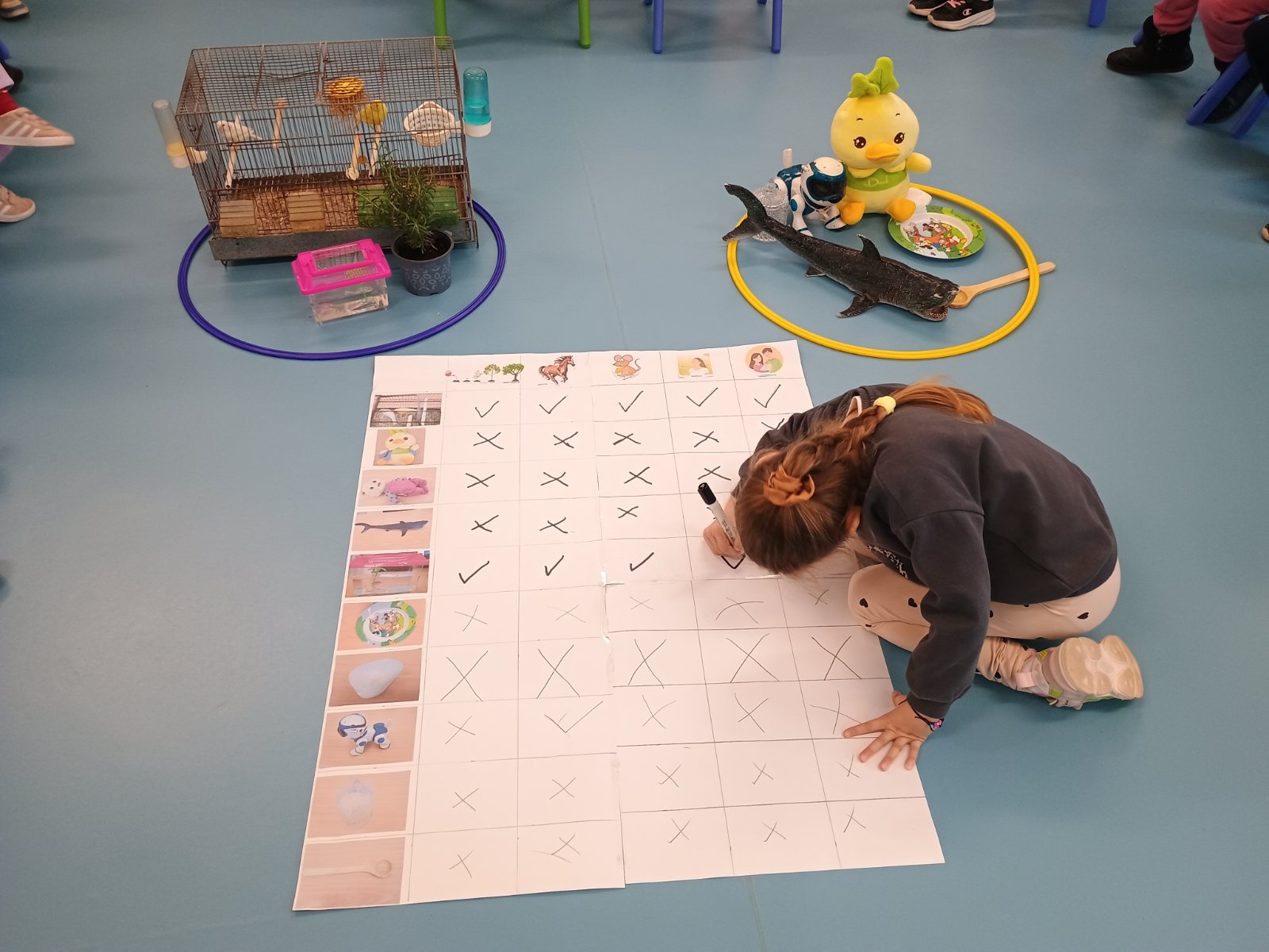 Η δραστηριότητα συνεχίστηκε στην αυλή του σχολείου, όπου τα παιδιά συνέλεξαν διάφορα έμβια και άβια στοιχεία που βρήκαν στο φυσικό περιβάλλον γύρω τους, παρατηρώντας τα και συζητώντας σε ποια κατηγορία ανήκουν.
