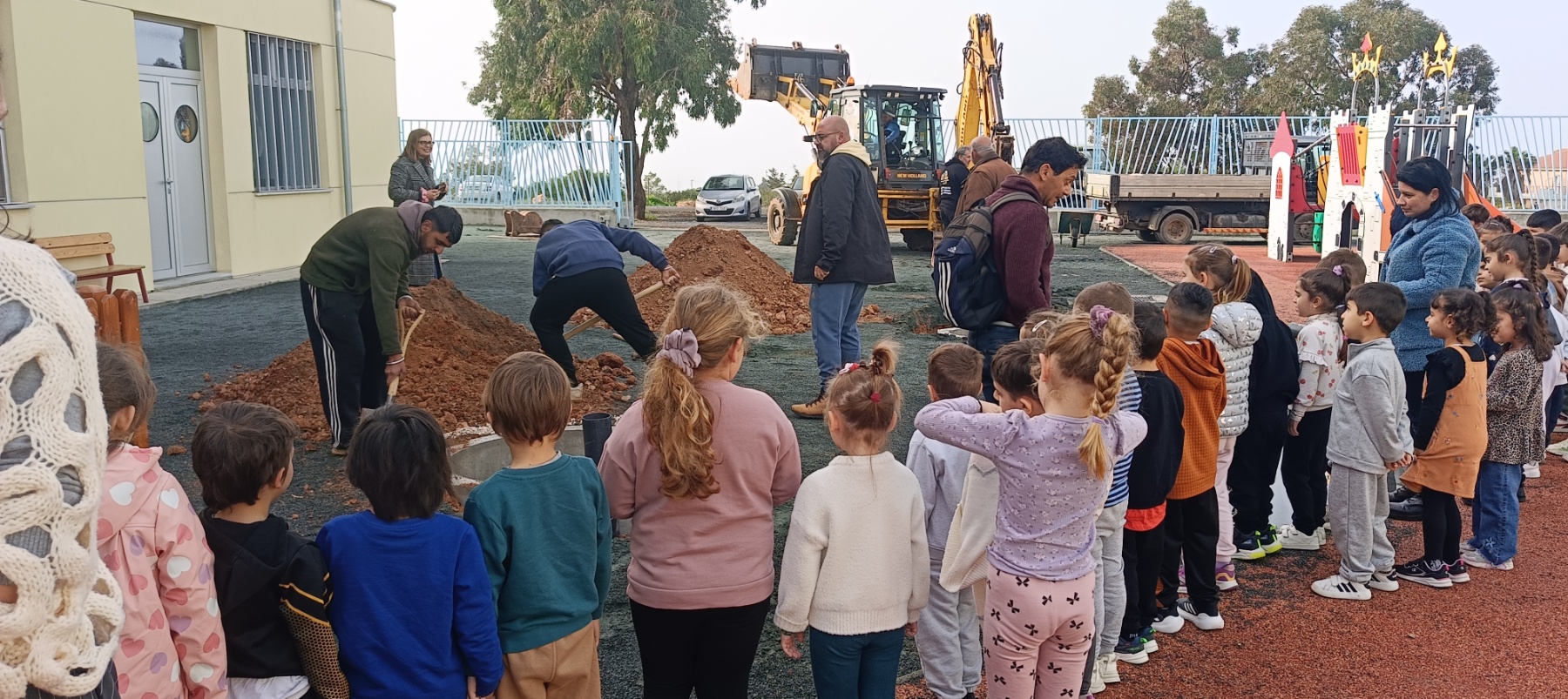 Σήμερα, 16 Φεβρουαρίου, πραγματοποιήθηκαν οι εργασίες προετοιμασίας του χώρου στον παιδότοπο. Εκσκαφέας άνοιξε τις τρύπες για τη φύτευση των τριών δέντρων για τη σκίαση στον παιδότοπο, τοποθετήθηκαν χαλίκια για σωστή αποστράγγιση και προστέθηκε κατάλληλο χώμα.