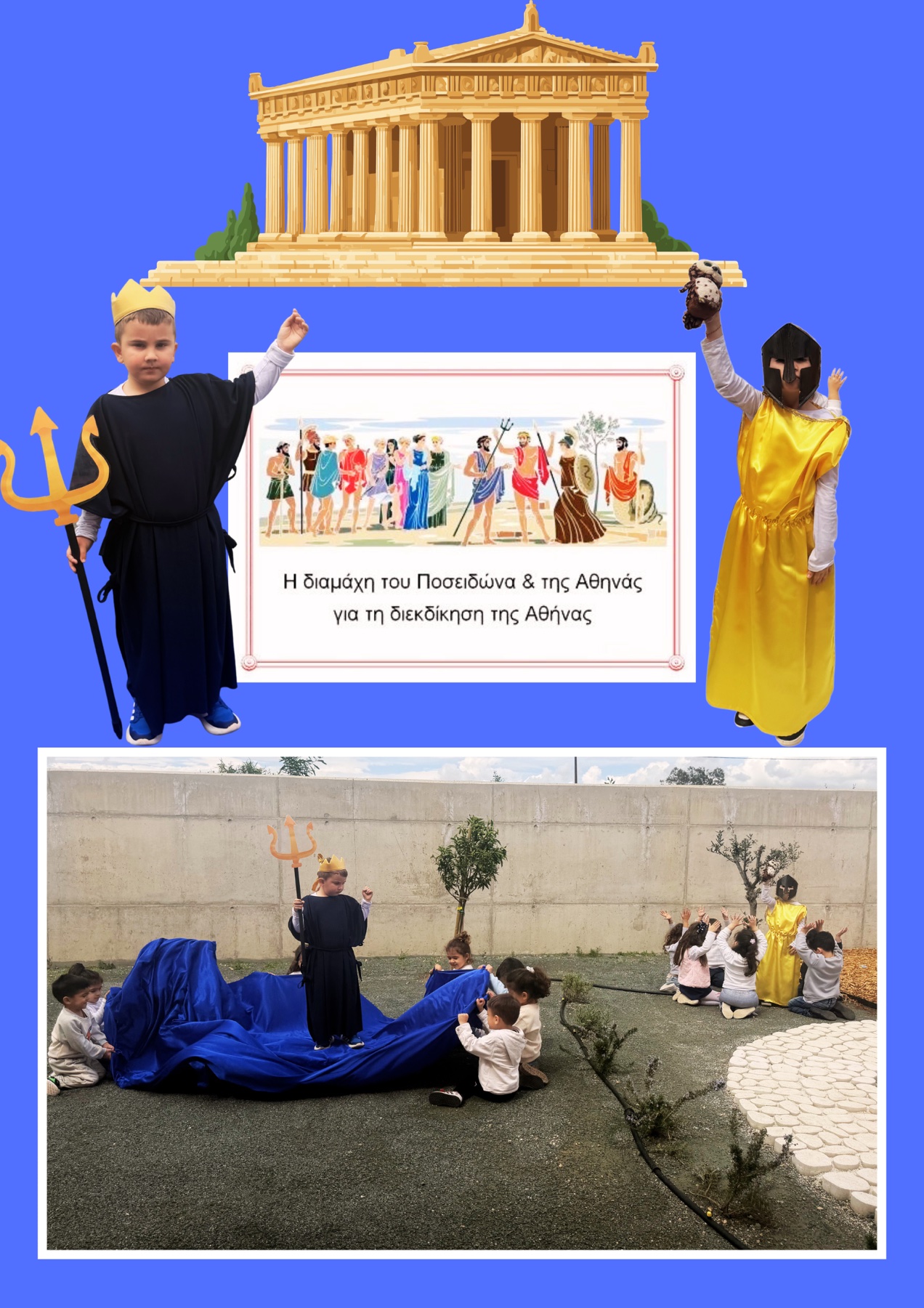 Η δραστηριότητα συνδέθηκε και με τη μυθολογία, καθώς τα παιδιά γνώρισαν τον μύθο της διαμάχης της Αθηνάς και του Ποσειδώνα για την προστασία της πόλης της Αθήνας. Σύμφωνα με τον μύθο, ο Ποσειδώνας και η Αθηνά διεκδικούσαν την πόλη της Αθήνας. Ο Ποσειδώνας χτύπησε με την τρίαινά του τον βράχο της Ακρόπολης και δημιούργησε μια πηγή, αλλά το νερό ήταν αλμυρό. Η Αθηνά φύτεψε την πρώτη, ιερή ελιά και χάρισε στους ανθρώπους της το ελαιόδεντρο, για αυτό και οι κάτοικοι επέλεξαν εκείνη ως προστάτιδα της πόλης.
